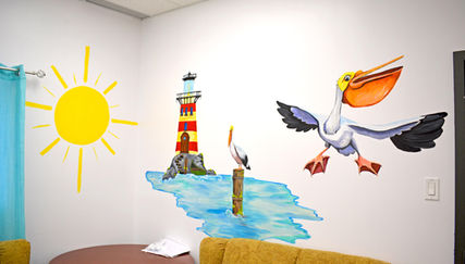 Nous avons mis notre talent au service de l’endroit afin de créer des salles thématiques. Une salle représente des scènes inspirées de l’univers des pirates, une salle dans laquelle on se retrouve sous l’eau avec des poissons rigolos, ainsi qu’une salle où les oiseaux marins sont en vedette, volant autour d’un phare.